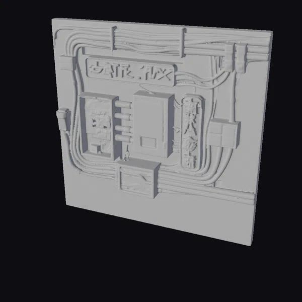 Positioned at an angle, the cyberpunk wall panel showcases a complex arrangement of neon signs, wires, and metallic components. The top neon sign glows with a warm orange light, while the one on the right radiates a cool purple hue. A blue-lit screen on the left adds a touch of modernity. The panel’s weathered metal surface, adorned with rust and wear, tells a story of age and neglect. Wires and pipes crisscross the panel, contributing to its industrial aesthetic. This 3D model is perfect for projects requiring a cyberpunk or sci-fi setting, such as game environments, animations, or architectural designs.