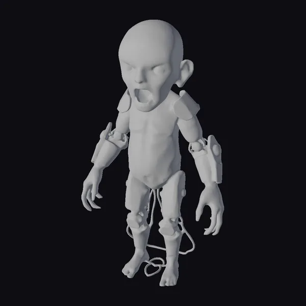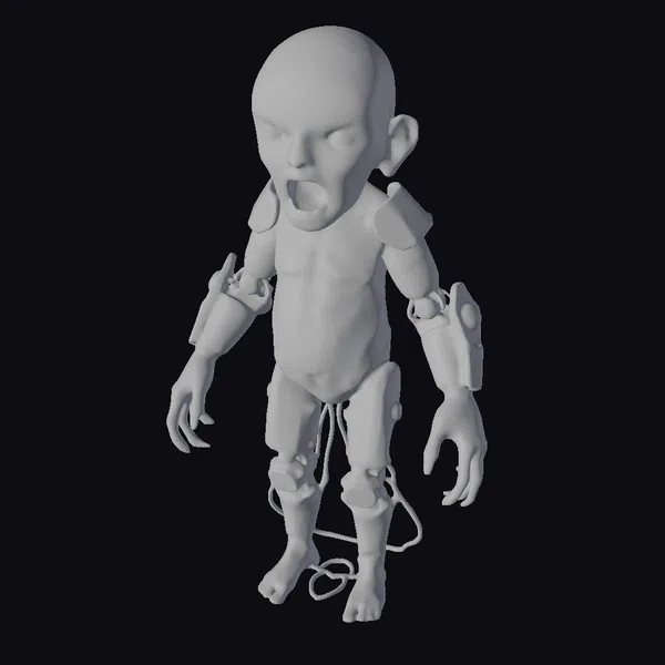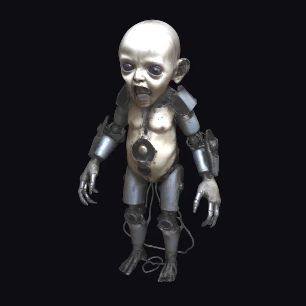 Standing with an unnatural posture, this cyborg baby hybrid exudes a sense of dread and unease. The pale, unhealthy baby torso and head contrast starkly with the dark, metallic cybernetic limbs, complete with exposed wiring and industrial details. The baby’s face contorts in a scream, adding to the overall sense of distress and discomfort. This 3D model would be perfect for sci-fi horror projects, games, or animations seeking to explore the darker side of technology and human-machine fusion. Its unique design and unsettling appearance are sure to grab attention and inspire creativity.