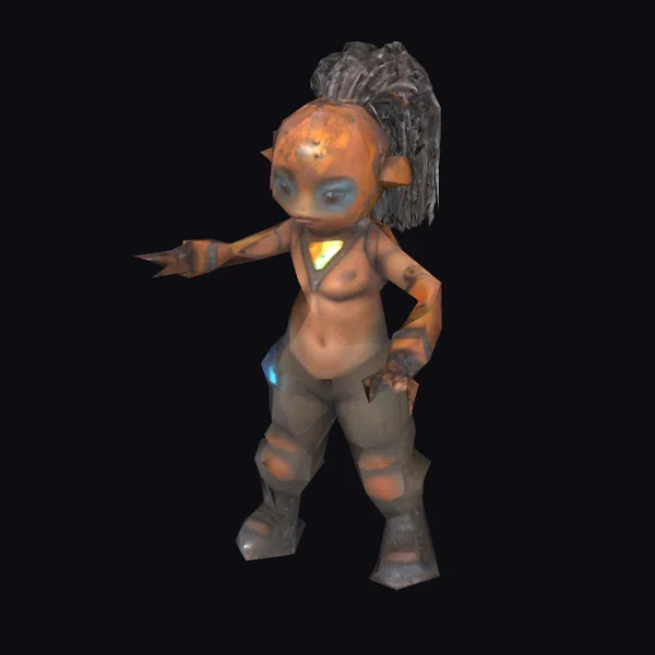 This stunning 3D model of a petite female cyborg, aptly named ‘Tank Metalhead,’ showcases a mesmerizing blend of organic and synthetic elements. Her body is adorned with a holographic rusty metal finish, complete with hyper-realistic textures that mimic the sheen of oiled metal. The model’s pose, with one arm extended and the other resting on her hip, exudes confidence and strength. Her facial features are delicately rendered, with a focus on the contrast between her natural skin tones and the metallic components. The intricate details, from the dreadlocks in her hair to the metallic accents on her arms and legs, make this model a standout in any sci-fi or cyberpunk setting. Ideal for use in games, 3D printing, VR/AR experiences, animation, and design projects, ‘Cyborg Girl Metalhead’ offers a unique and captivating character that is sure to leave a lasting impression.