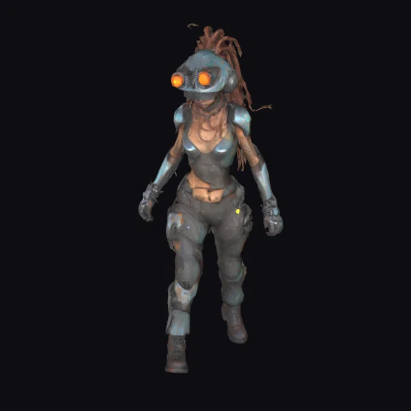 This striking cyborg female is captured in a dynamic pose, her petite frame belied by the imposing metallic armor that covers her. The holographic rusty metal finish gives her a worn, battle-hardened appearance, while hyper-realistic textures – including oiled metallic surfaces – add a layer of depth and realism. Her dreadlocked hair escapes from under a metallic headpiece, framing her face and contrasting with the mechanical components. Orange glowing eyes seem to pierce through the darkness, lending an air of mystery and menace. The model’s proportions are meticulously detailed, from the muscles beneath her metallic skin to the intricate design of her armor. She would be perfect for use in sci-fi games, virtual reality experiences, 3D printing, animation projects, or concept design, where a blend of human and machine is required.