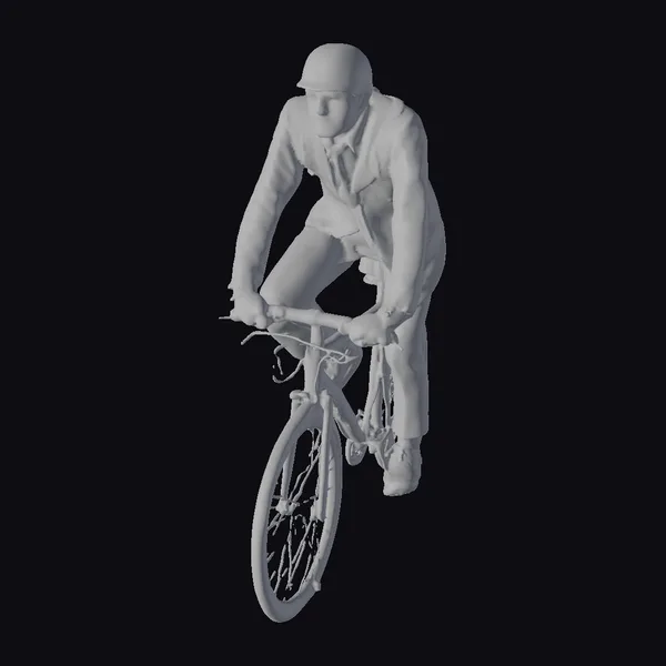 In a moment frozen in time, a man is captured leaning into his bicycle, exuding a sense of urgency and speed. His attire, consisting of a sleek black helmet, a light grey long-sleeved shirt speckled with darker shades, black trousers, and shoes, suggests a blend of professionalism and athleticism. The model showcases intricate details such as the texture of the clothing, the sleek design of the bicycle, and the focused expression on the man’s face. Ideal for projects requiring a realistic depiction of daily urban life, this model can be used in animations, games, virtual reality experiences, or architectural visualizations to add a touch of authenticity and movement.