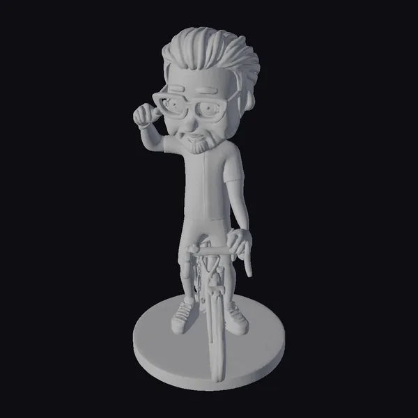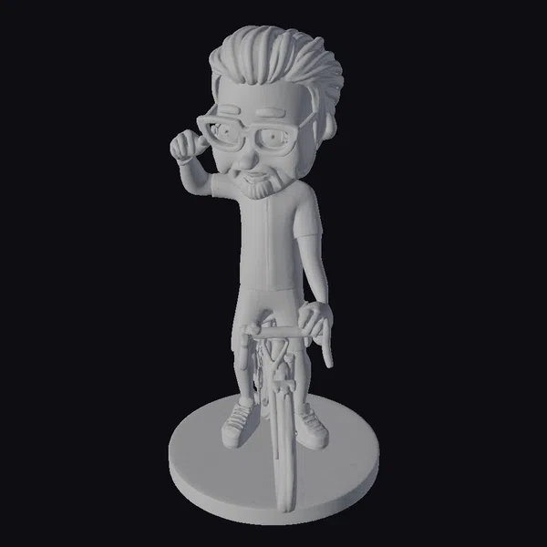 Perched atop a bright yellow circular base, this delightful cyclist figurine strikes a casual pose, one hand adjusting his black-framed glasses as if surveying the distance. His short gray hair is styled in a modern pompadour, complementing his neatly trimmed beard and mustache. The cyclist’s attire consists of a fitted blue shirt, black shorts, and vibrant yellow shoes, perfectly capturing the spirit of a leisurely bike ride. The white and black bicycle, complete with handlebars and a front wheel, adds a dynamic element to the scene. This figurine’s proportions are well-balanced, with detailed textures that bring the character to life. Its cartoonish style makes it an excellent choice for projects requiring a friendly, approachable vibe, such as animations, games, or even 3D printing. The model’s high level of detail, especially in the facial features and accessories, makes it versatile for various applications, from graphic design to virtual reality experiences.
