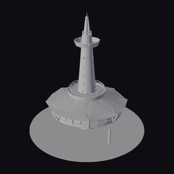 Perched atop a circular base, the lighthouse tower rises in a tapered form, its metal exterior now a patchwork of rust, decay, and fire damage. The surface is pockmarked with small holes and discolored panels, while the pointed top remains intact, a striking contrast to the destruction below. As the light source is extinguished, the tower’s rugged texture and weathered appearance evoke a sense of abandonment and neglect. This detailed model is perfect for projects requiring a realistic, damaged coastal lighthouse, ideal for use in games, architectural visualizations, or 3D printing projects focused on industrial or coastal themes.