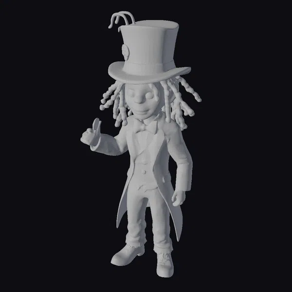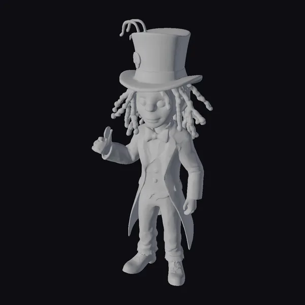 This charming character boasts an intricate design, with shoulder-length dreads locs peeking out from under his sleek top hat, adorned with a vibrant red band and a delicate feather. His tattered, once-formal suit, complete with a crisp white shirt, golden bow tie, and matching vest, tells a story of refinement and whimsy. The gentleman’s pose, with one hand gesturing and the other relaxed by his side, invites the viewer into a world of stylized fantasy. His large, expressive eyes sparkle with amusement, adding to the character’s allure. This model is perfect for projects requiring a touch of humor and elegance, such as animations, games, or designs seeking a unique, stylized character.