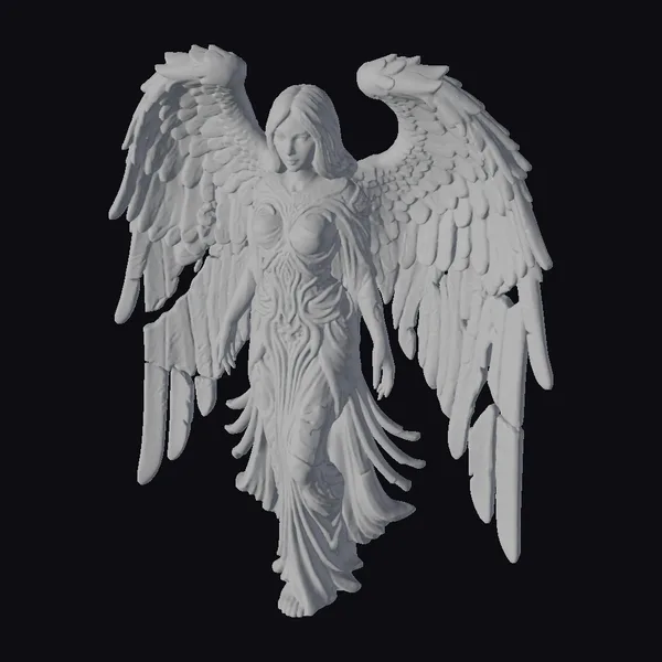 Standing with wings outstretched, this dark angel exudes an aura of mystique and power. Her serene face, framed by long hair, contrasts with the ominous tone of her weathered form. The dress, adorned with intricate patterns, appears to be a part of her being, merging seamlessly with her body. Each feather on her wings is meticulously detailed, capturing the essence of dark fantasy. This sculpture is perfect for use in games, 3D printing, VR/AR experiences, animation, and design projects, offering a touch of gothic elegance.