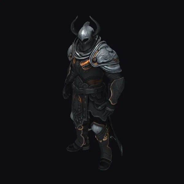 Detailed visual breakdown reveals a warrior standing tall in a T-pose, donning a suit of heavy plate armor that seems to have been forged from the very darkness itself. The armor’s surface is adorned with glowing magma veins, pulsing with an inner fire that seems to sear the very air around it. The horned helmet adds a touch of the beastly, while the PBR textures bring a level of realism that makes the fantastical elements all the more believable. The armored boots are as imposing as the rest of the gear, completing the look of a warrior ready to take on the darkest of foes. Naturally, such a detailed model would find its place in games, 3D printing projects, VR/AR experiences, animations, or even design projects looking for a dark, fantastical edge.