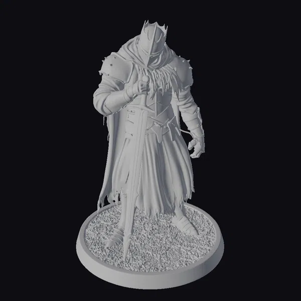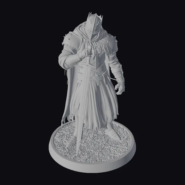 This imposing figure is captured in a moment of eerie silence, standing on a patch of grass with a black base, the knight’s armor gleams with a dark metallic sheen. The red cape flows behind him, tattered and worn, while his helmet’s visor glints with a fiery hue. The sword, stained with blood, hangs at his side, a testament to battles past. The intricate details of the armor, the texture of the cape, and the menacing stance evoke a sense of dark fantasy. Ideal for use in games, 3D printing, VR/AR experiences, animation, and design projects seeking a touch of the medieval and mysterious.