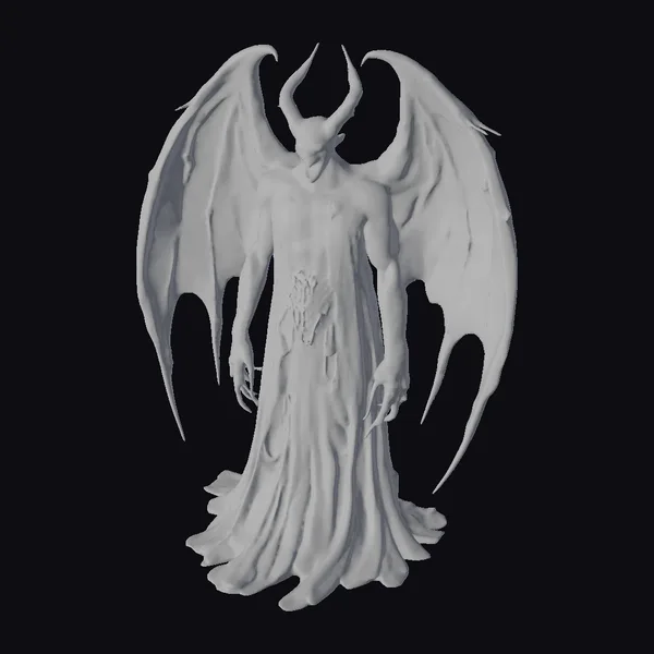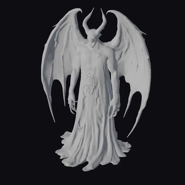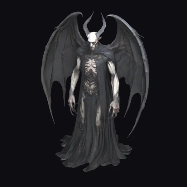 Standing tall with an air of mystique, this dark humanoid boasts an impressive wingspan, its bat-like wings spread wide. The skeletal torso visible beneath its dark, flowing attire adds a layer of eeriness. Two curved horns protrude from its head, enhancing its formidable appearance. The humanoid’s hands are transformed into sharp-clawed bat wings, completing its fantastical and intimidating look. This model is perfect for projects requiring a dark, mystical, or gothic character, such as games, animations, or 3D printing. Its detailed design and elegant yet massive proportions make it a compelling addition to any fantasy or sci-fi scene.