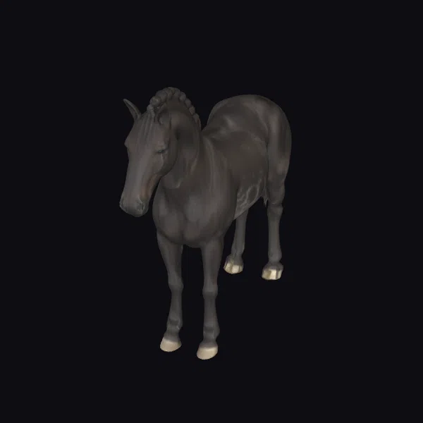 In a stunning display of equine elegance, this dark bay horse stands poised, its body angled slightly to the left. The model’s intricate details, from the muscles beneath its shiny coat to the texture of its mane, are meticulously rendered. The horse’s dark brown body is beautifully contrasted with its lighter-colored hooves, adding to its realistic appeal. This model is perfect for projects requiring a lifelike horse, whether for animation, game development, architectural visualization, or any other creative endeavor where authenticity is key.