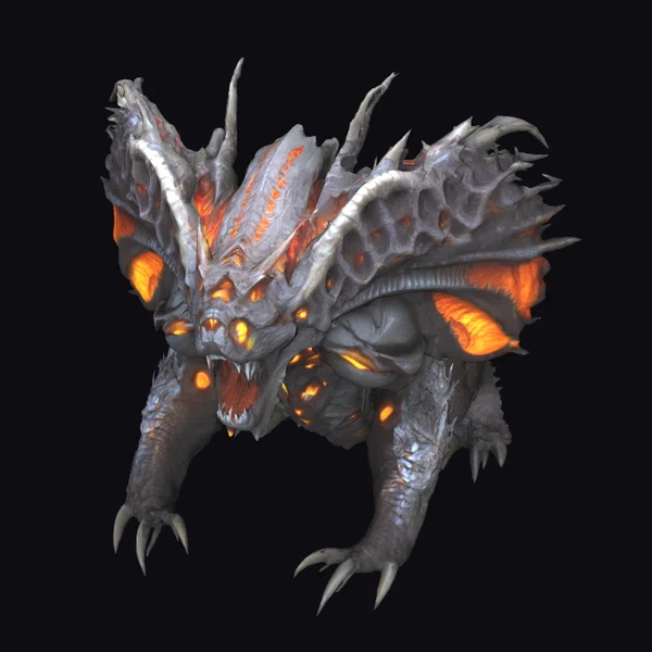 Detailed visual breakdown reveals a creature with a menacing stance, its body covered in dark, layered plate armor that appears to be held together by chaotic, glowing energy. The armor’s rough texture and the creature’s sharp claws and teeth evoke a sense of ferocity. Glowing orange accents on its face, ears, and body add to its intimidating appearance. The entity’s abstract, feral design makes it a compelling addition to any fantasy or sci-fi project, suitable for use in games, 3D printing, VR/AR experiences, animation, and design applications.