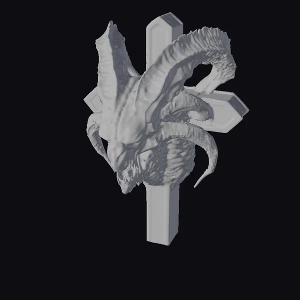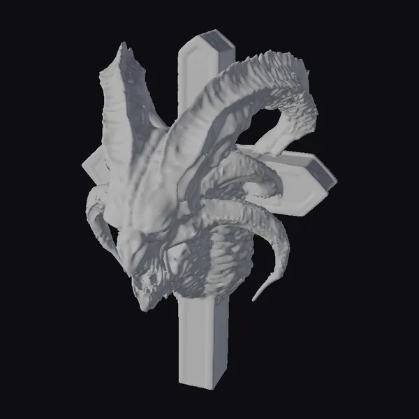 Perched atop a stone-like crucifix, the dark deity’s head is a masterclass in eerie, unsettling design. The curved horns, resembling twisted, organic growths, frame a face that seems to contort in a mixture of pain and malevolence. The skin appears rough, stone-like, with visible texture that suggests a twisted, nightmarish reality. As a 3D model, this dark deity’s head is perfect for use in horror-themed games, animations, or designs seeking to evoke a sense of dark fantasy and foreboding. Its unique blend of gothic and mythical elements makes it an intriguing addition to any project.