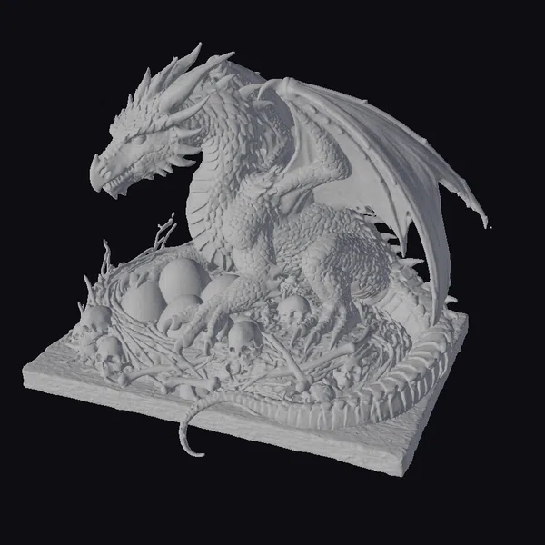 Positioned in a protective stance, the dragon’s body language exudes a sense of warning, its sharp claws gripping the nest which contains several large eggs and smaller skulls. The dragon’s scales shimmer with a dark, metallic sheen that catches the light, highlighting its formidable presence. Its wings, spread wide, suggest readiness to take flight at a moment’s notice. The intricate details, from the texture of the nest to the reflective quality of the dragon’s scales, make this model a compelling addition to any fantasy setting. Ideal for use in games, animations, or as a piece of digital art, this model brings a touch of epic fantasy to any project.