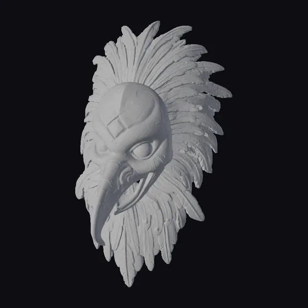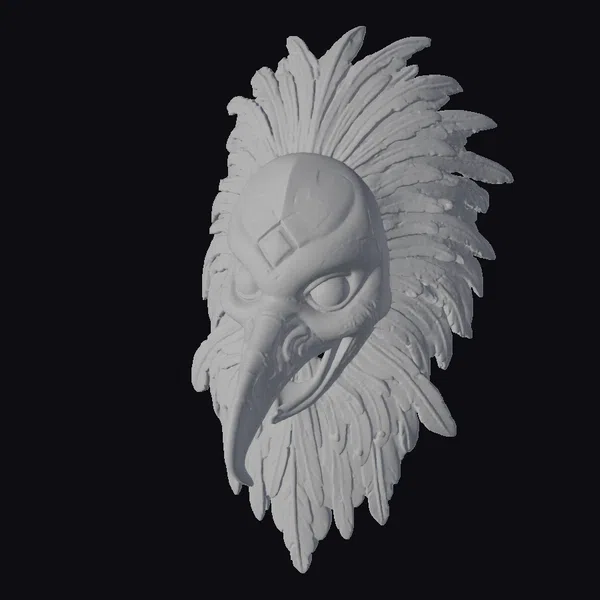 Crafted from dark ebony wood, this intricately designed ritual mask features a mesmerizing array of details. The inlaid abalone shell eyes shimmer with iridescent colors, casting an otherworldly glow. A wild tangle of black feathers surrounds the mask, with hints of red and blue paint adding a touch of mystique. The elongated beak and sharp teeth create a sense of foreboding, as if the mask is about to come to life. Perfect for use in games, 3D printing, VR/AR experiences, animation, or design projects, this mask is sure to add a touch of the unknown to any creative endeavor.