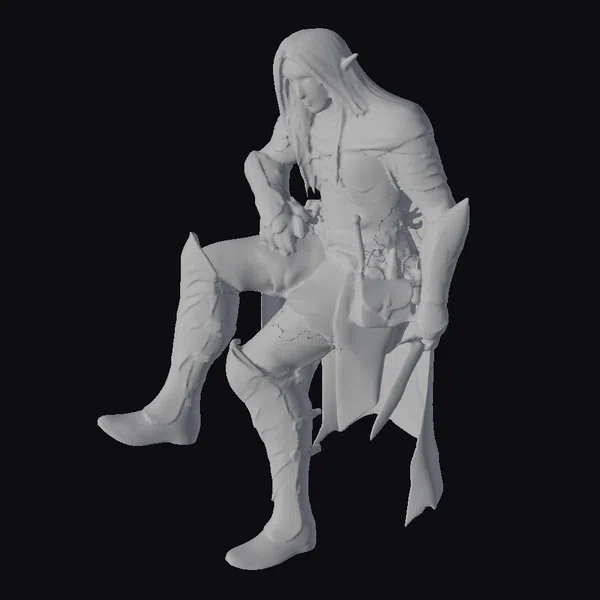 In a pose that speaks of both relaxation and readiness, the dark elf warrior sits on a chunk of rough, battle-worn stone, his right leg crossed over his left knee. His armor, a mix of leather and metal, is predominantly dark, with hints of silver and grey that catch the light, suggesting a craftsmanship that balances functionality with a touch of elegance. The warrior’s attire includes a flowing cape, its edges frayed and battle-worn, adding to his fearsome appearance. A sword with a uniquely shaped blade rests against his leg, a constant companion that seems to be an extension of himself. The model is meticulously detailed, from the texture of the armor to the expression of the elf, making it suitable for a variety of applications including game development, animation, and print-on-demand products. Its high level of detail and realism makes it an excellent choice for projects that require a touch of fantasy and adventure.