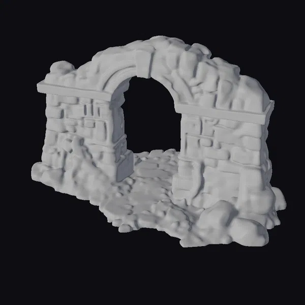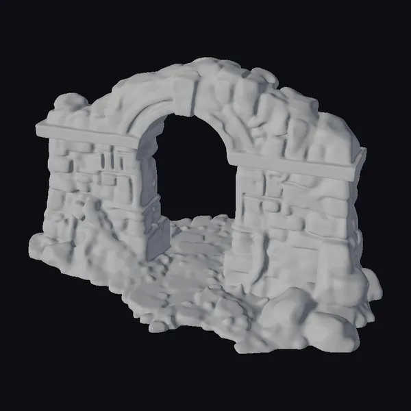 Perched atop a foundation of rough-hewn stones, the archway stands as a testament to the ingenuity and craftsmanship of a long-lost dwarven civilization. The surface of the wall is weathered to a rich, dark grey, with hints of brown and black that evoke a sense of age and decay. Brass accents, now dulled by the patina of time, add a touch of elegance to the otherwise rugged structure. As the eye travels upward, it’s drawn to the intricate details that adorn the arch, a blend of geometric patterns and organic shapes that seem to dance across the surface. The model is meticulously detailed, with textures that invite the viewer to reach out and touch the rough stone or the smooth, worn brass. This 3D model is perfect for game developers, architects, and artists seeking to add a touch of dark fantasy to their projects. It can be used in a variety of applications, from video game environments and animated films to architectural visualizations and concept art.