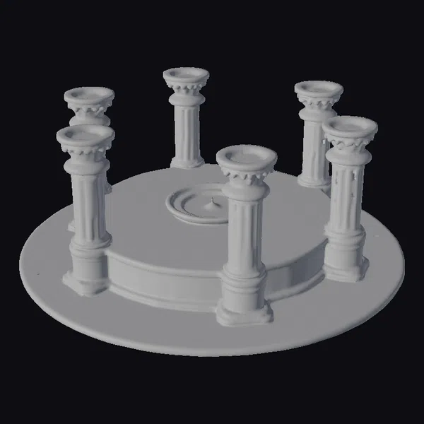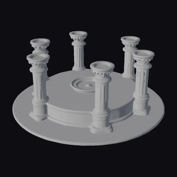 Perched atop a circular base, this intricately designed altar features a deep red center encircled by gold accents, surrounded by a smooth black stone surface. Six ornate pillars, each with a hollow top, rise from the base, adding to the structure’s mystique. The altar’s design draws inspiration from Melnibonean architecture, evident in its elegant, ancient aesthetic. The combination of materials and textures – stone, gold, and red – creates a visually striking piece. Ideal for use in games, 3D printing, VR/AR experiences, animation, and design projects, this model brings a touch of dark fantasy to any creative endeavor.