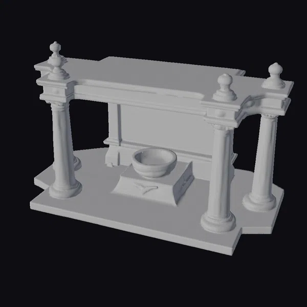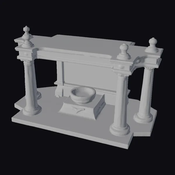 Positioned against a stark white backdrop, the altar’s imposing structure commands attention, its black stone surface reflecting light with a subtle sheen. Delicate gold etchings dance across the surface, framing the central golden bowl that rests upon a smaller pedestal. The four pillars, adorned with red and gold details, rise from the base like sentinels, their intricate patterns evoking a sense of ancient mysticism. As a focal point for dark fantasy settings, this altar model lends itself to various applications, including game environments, 3D printing, virtual reality experiences, and animation projects, where its eerie elegance can set the tone for foreboding rituals or mystical ceremonies.