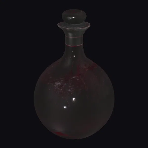 Crafted with meticulous attention to detail, this dark glass potion bottle exudes an aura of ancient mysticism. The bottle’s rounded body, a deep, rich burgundy, seems to glow with an inner light. Its surface bears a subtle texture, suggesting age and use. A slender neck, encircled by a thin red line, supports a perfectly rounded stopper, completing the bottle’s elegant silhouette. When light catches the bottle, it highlights the intricate details and the slight imperfections in the glass, adding to its allure. Ideal for use in games, 3D printing, virtual reality, animation, and design projects, this model brings a touch of history and mystery to any scene.