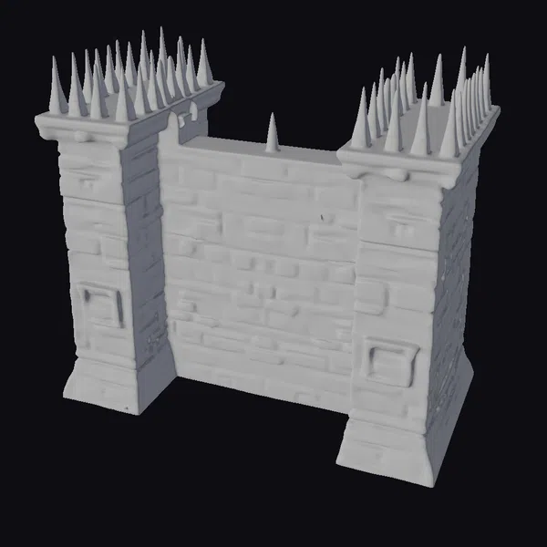 Perched atop a foundation of rough-hewn stone, this fortress wall section rises with a sturdy presence, its dark grey bricks stacked with a rugged texture that suggests age and resilience. The wall’s surface is punctuated by square protrusions, adding to its fortified appearance. But it’s the metal spikes – sharp and plentiful – that truly set this structure apart, lending an air of danger and defense. Whether you’re crafting a medieval landscape, a gothic scene, or a fantasy realm, this wall model brings an element of strength and mystery. Its detailed design makes it perfect for 3D printing, game environments, or architectural visualizations where realism and atmosphere are key.