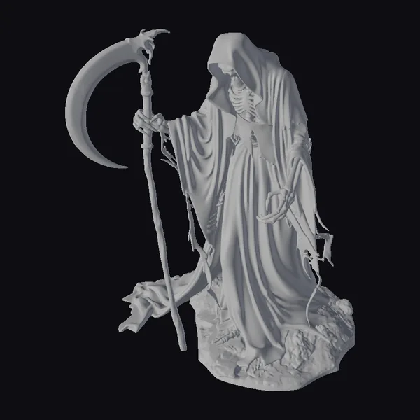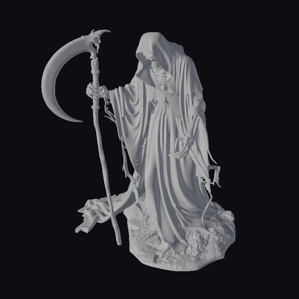 Standing tall with an air of ominous presence, this detailed 3D model of a grim reaper captures the essence of darkness and fear. The skeleton, draped in a tattered black robe, holds a large, menacing scythe in one hand, while the other hand remains hidden, possibly clutching an hourglass or another attribute. The model’s base appears to be rocky or made of dark stone, adding to the overall gothic ambiance. The skeletal structure is intricately detailed, with clear definitions of the bones, while the robe’s folds and creases are meticulously rendered, suggesting a high level of realism. This model is ideal for use in games, animations, or 3D printing projects that require a character with a strong, dark theme.