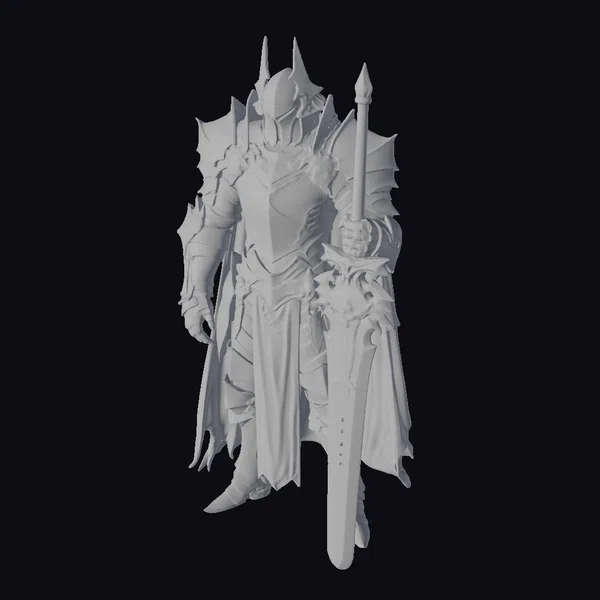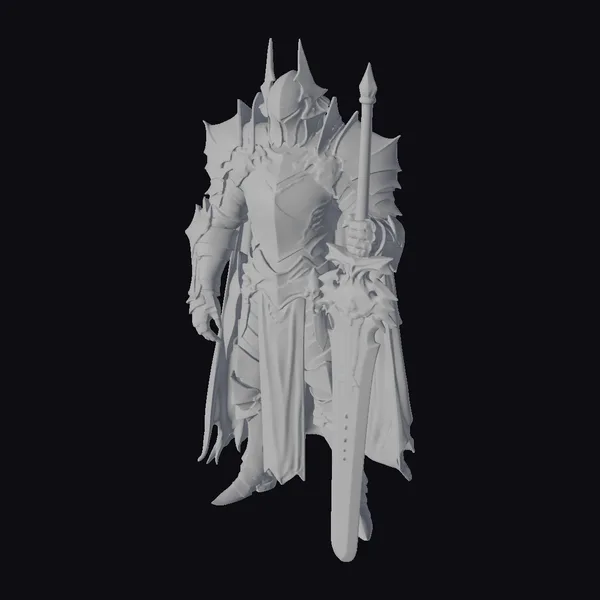 This imposing figure is captured in a dynamic pose, showcasing the intricate details of the dark knight’s armor. The metallic surface reflects light, highlighting the gold trimmings that add a touch of elegance to the otherwise fearsome attire. The armor consists of a helmet with pointed protrusions, a chest plate, shoulder guards, and a tattered cape that flows behind like a dark cloud. The knight’s right hand firmly grasps the hilt of a large sword, its blade marked with red etchings that suggest a history of battles. The left hand hangs by the side, glove armored for protection. The model’s proportions are well-balanced, making it suitable for various applications including games, 3D printing, virtual reality, and animation. The level of detail, from the texture of the metal to the flow of the cape, ensures a high-quality visual impact.