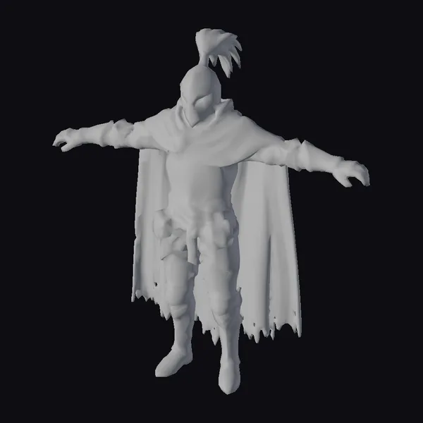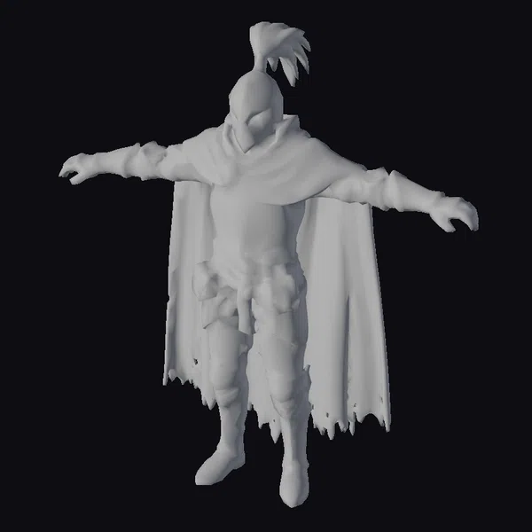 Detailed with precision, this dark knight armor model showcases a complex assembly of metallic parts, from the segmented gauntlets to the articulated greaves. The tattered cape flows dynamically from the shoulders, while the helmet’s blue feather adds a pop of color. Ideal for use in dark fantasy settings, games, or animations where a formidable warrior is needed. The model’s level of detail makes it suitable for close-up shots or scenes requiring a high level of realism.