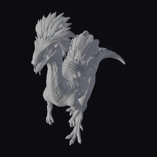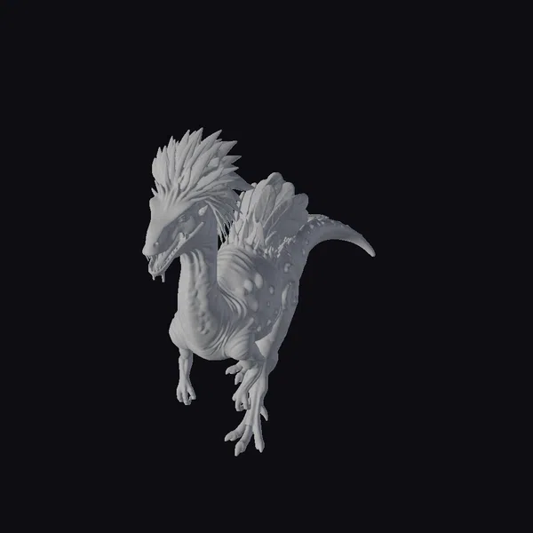 Positioned in a dynamic stance, this fantasy dragon creature showcases intricate details such as textured scales that gradate from dark to purple hues, and feathers on its back and head that seem to ripple with a life of their own. The creature’s eyes glow with an ethereal light, adding to its mystique. Its pose suggests movement, as if it’s about to take flight or pounce. The model is rich in detail, from the subtle texture of its scales to the delicate feathers, making it perfect for use in games, 3D printing, VR/AR experiences, animation, and design projects where a touch of fantasy is needed.
