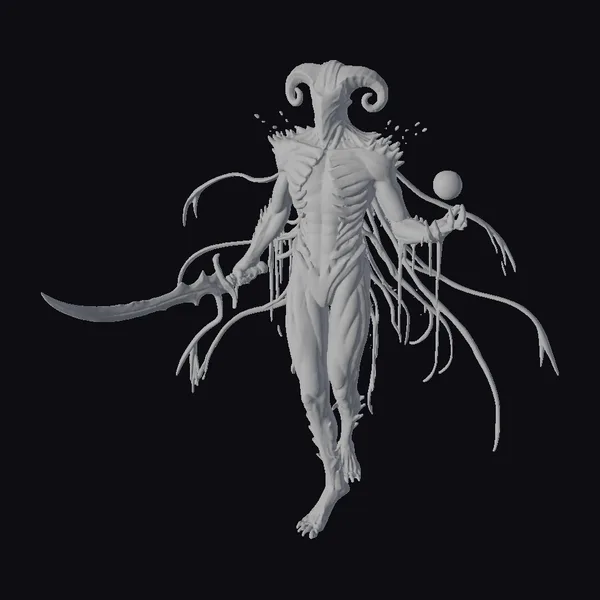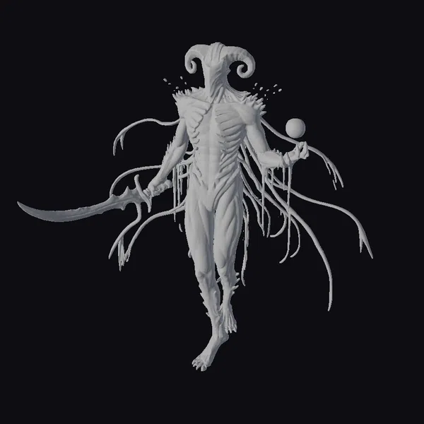 Standing tall with an imposing presence, this dark ram guardian exudes malevolence. Its body, a mesh of dark metallic and shadowy textures, seems to absorb light. The ram-like horns on its head curl elegantly upwards, contrasting with the chaotic, spiky armor pieces around its neck. Glowing purple and orange lights trace along its chest, pulsing with an eerie energy. In one hand, it grasps a sword with a similarly glowing blue edge, while the other hand holds a radiant orb. Long, thin tentacles sprout from its back and arms, adding to its terrifying silhouette. Ideal for games, animations, or any dark fantasy project seeking a formidable character.