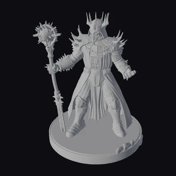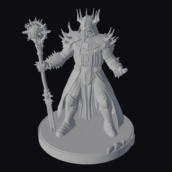 Standing atop a dark, circular base, the Dark Sorcerer of the Void commands attention with his imposing stance. His armor, a latticework of dark, metallic plates, is studded with spikes that seem to reach out like thorns. A staff, its surface a mass of jagged, glowing protrusions, pulses with dark energy in his hand. The sorcerer’s helmet, adorned with spiked protrusions, casts a shadow over his face, while his eyes burn with an unearthly green fire. A flowing cape, lined with a deep, fiery red, cascades down his back, lending an air of drama to his already formidable presence. This 3D model is perfect for use in games, animations, or 3D printing projects that require a character of dark, foreboding power.