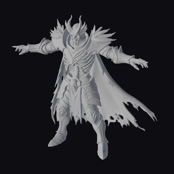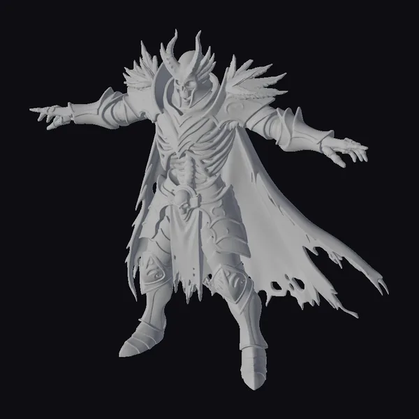 Standing tall with arms outstretched, this dark sorcerer warrior exudes an aura of malevolent power. The intricate metallic armor features jagged spikes and a ribcage-like chest plate, while the long, tattered cape flows behind like a dark cloud. Glowing blue-green accents on the armor and belt add an otherworldly glow. The sorcerer’s helmet features a skeletal face with glowing eyes, completing the terrifying appearance. This model is ideal for use in games, animations, or 3D prints where a dark, mystical atmosphere is desired.