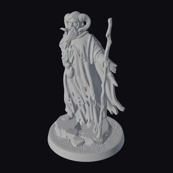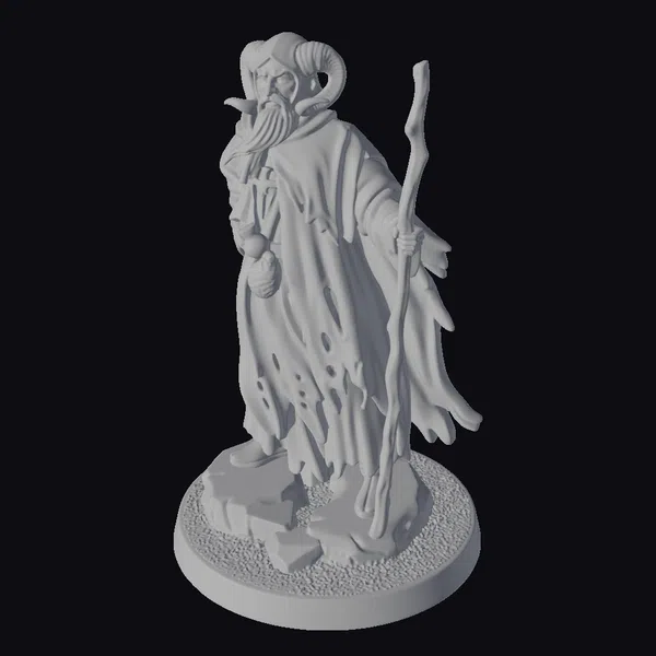 The sorcerer is captured in a dynamic pose, his ram horns and long gray beard a testament to his mystical and aged appearance. The tattered robe flows around him, suggesting movement and a life of its own. He grasps a staff in one hand and a pouch in the other, symbols of his magical abilities. The base, resembling rocky terrain, adds to the immersive fantasy setting. This model is perfect for enhancing games, animations, or virtual reality experiences with its detailed and realistic design.