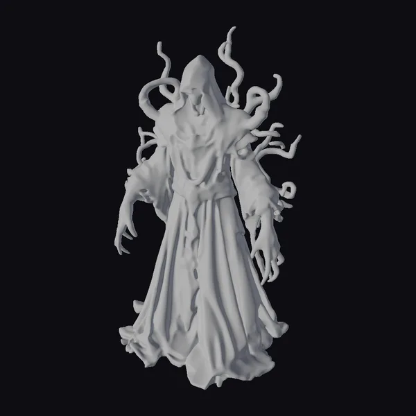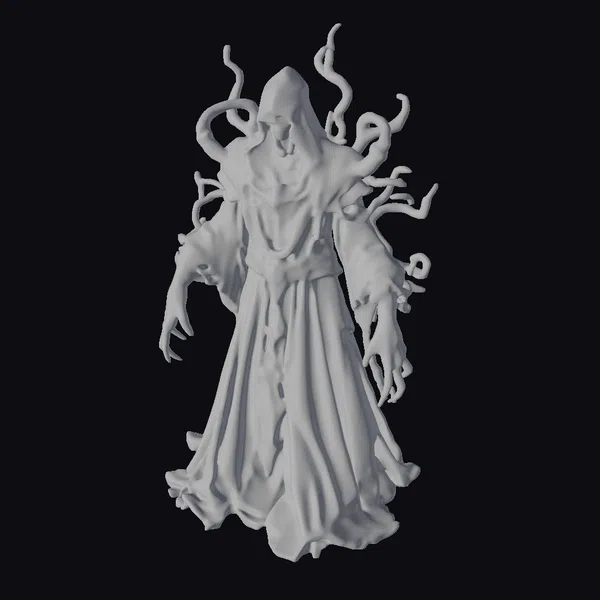 This dark void lord model is meticulously designed with a focus on detail, from the flowing dark robes to the twisted tendrils that emerge from and wrap around his body. The figure’s face is shrouded in shadows, adding to the mystery and horror elements. The model’s pose, with arms outstretched and tendrils swirling around, captures a dynamic moment of emergence from the shadows. Textures are rich and varied, with the dark, almost velvety appearance of the robes contrasting with the rough, organic look of the tendrils. This model is ideal for use in games, 3D printing, VR/AR experiences, animation, and design projects where a touch of dark fantasy or horror is needed.