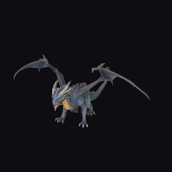 In a powerful stance with wings spread wide, this majestic creature commands the space around it. The dragon’s body is covered in dark, overlapping scales that shimmer slightly under the light, suggesting a life-like texture. Its wings, long and narrow, are poised as if ready to take flight. The head, with its sharp horns and open mouth revealing a fiery interior, adds to the creature’s fearsome appearance. The contrast between the dark exterior and the glowing yellow underbelly adds depth to the model. Ideal for use in games, 3D printing, VR/AR experiences, and animation projects, this model brings a touch of fantasy and adventure to any project.