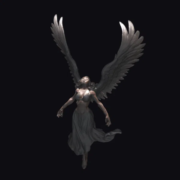 In a majestic pose that commands attention, the dark-winged goddess is captured in mid-descent, her body angled towards the ground with grace and poise. Her wings, a striking feature, are spread wide, showcasing detailed feathers that gradate from dark to light, suggesting a subtle play of light and shadow. The goddess’s form is draped in a flowing dress that billows behind her, adding a sense of movement and drama to her appearance. The texture of her skin and the intricate details of her wings and dress are rendered with high fidelity, inviting the viewer to explore the nuances of this mythical being. This model is perfect for projects that require a touch of the divine, the mysterious, or the powerful, such as animations, games, or architectural visualizations seeking a fantastical element.