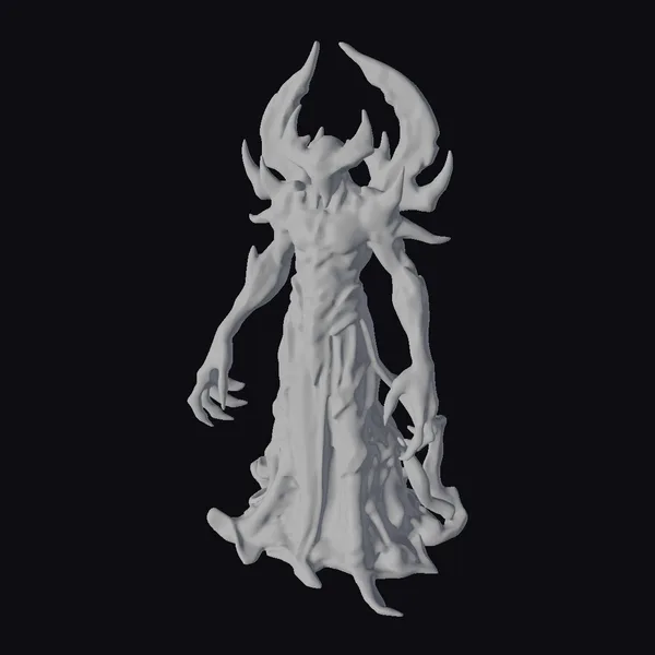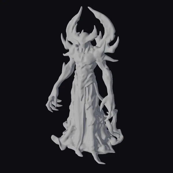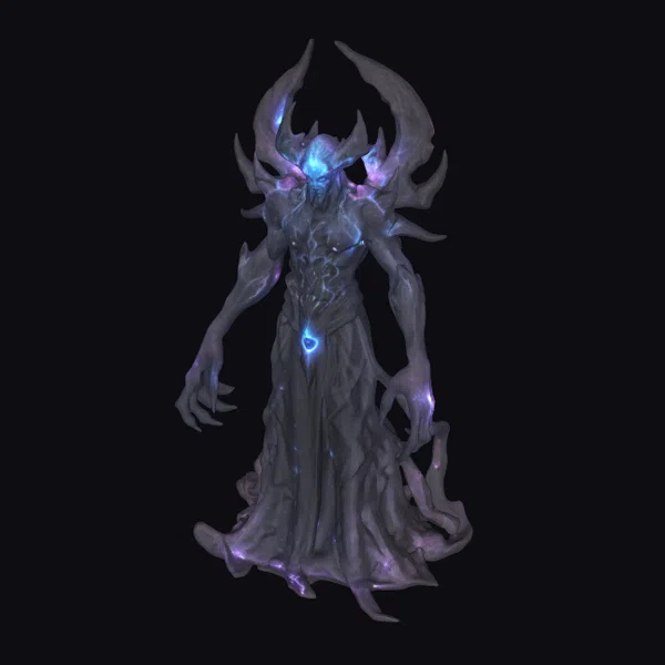 This imposing figure stands with an undefined form, its body a swirling mass of dark, ethereal material that seems to shift and writhe like living shadow. Glowing blue and purple accents pierce through the darkness, suggesting the presence of distant stars and nebulae trapped within its form. The entity’s face is obscured, but two glowing blue areas serve as eyes, casting an unsettling gaze. Sharp, curved protrusions adorn its head and shoulders, enhancing its menacing appearance. The long, flowing garment-like appendages at its sides appear to be an extension of its body, contributing to its formidable and eerie presence. Ideal for projects requiring a cosmic horror or fantasy creature, this model is suited for use in games, animations, VR/AR experiences, and design projects where a sense of dark, cosmic power is needed.