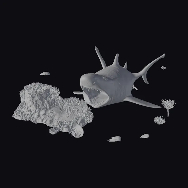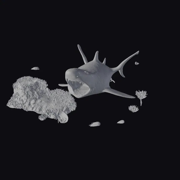 In a scene that defies the natural order, a deceased shark rests on the ocean floor, its body eerily preserved. The shark’s mouth is frozen in a perpetual scream, revealing rows of sharp teeth. Surrounding this macabre centerpiece, a school of small fish darts about, adding a burst of life and color to the scene. A large, stylized coral formation rises from the depths, its tendrils swaying gently in the current. The coral itself is a riot of colors, with hues of pink, orange, purple, and yellow blending together in an otherworldly display. This 3D model scene is perfect for use in games, animations, or virtual reality experiences where a fantastical underwater setting is needed. The stylized nature of the model allows it to fit seamlessly into a variety of projects, from children’s educational software to more mature, fantasy-oriented games.