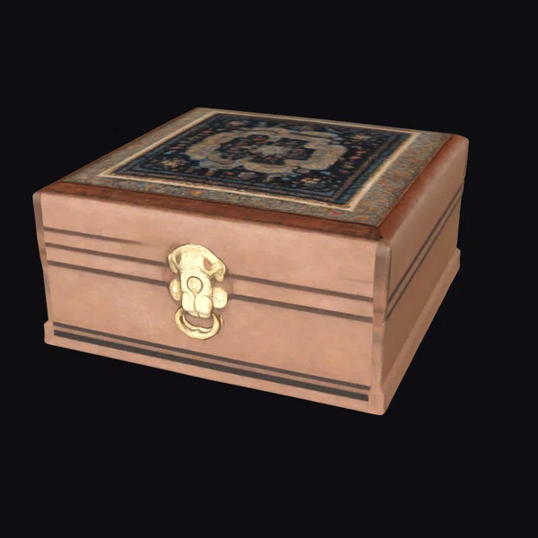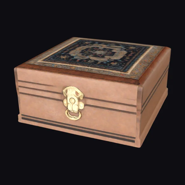 Positioned at a slight angle, the wooden box reveals its expertly detailed craftsmanship. The lid’s central design features a stunning blue and gold floral motif, bordered by a delicate pattern that adds depth and visual interest. The box’s body is wrapped in a leather-like material, complete with three horizontal lines that enhance its traditional aesthetic. A beautifully rendered gold clasp adds a touch of sophistication, inviting the viewer to imagine its use in various settings, such as games, animation, or even as a design reference. The box’s proportions and textures are meticulously rendered, making it suitable for high-quality 3D applications.