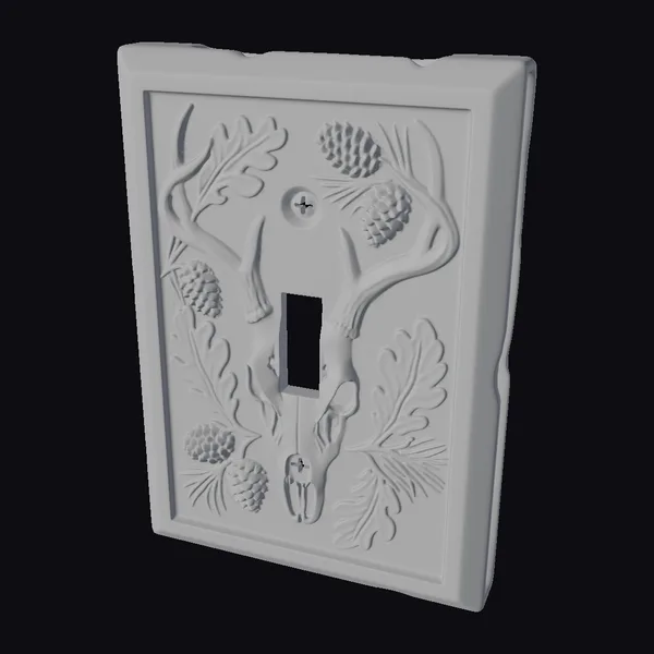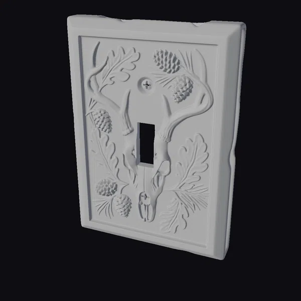 Crafted with meticulous attention to detail, this switch plate boasts a stunning bronze finish, complete with a deer skull and antlers at its center. Delicate oak leaves and pinecones are intricately woven around the skull, adding a touch of rustic charm. The plate’s rectangular shape and raised edges give it a sturdy, three-dimensional appearance. Perfect for those who appreciate the great outdoors, this decorative piece can elevate the ambiance of any room, making it ideal for use in games, 3D printing projects, virtual reality experiences, animations, or architectural designs.