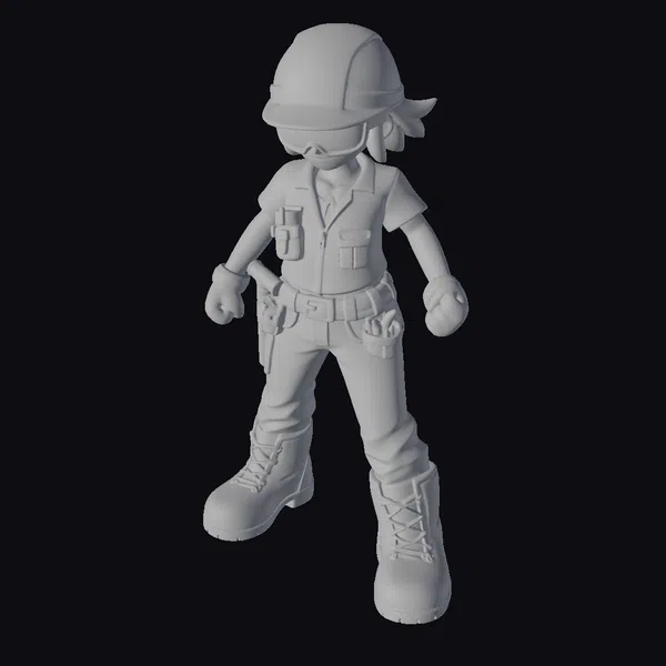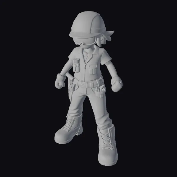 Step into the world of demolition with this rugged worker character, clad in a vibrant orange hard hat, safety vest, and sturdy boots. A blue ribbon flows from their goggles, adding a pop of color to their outfit.