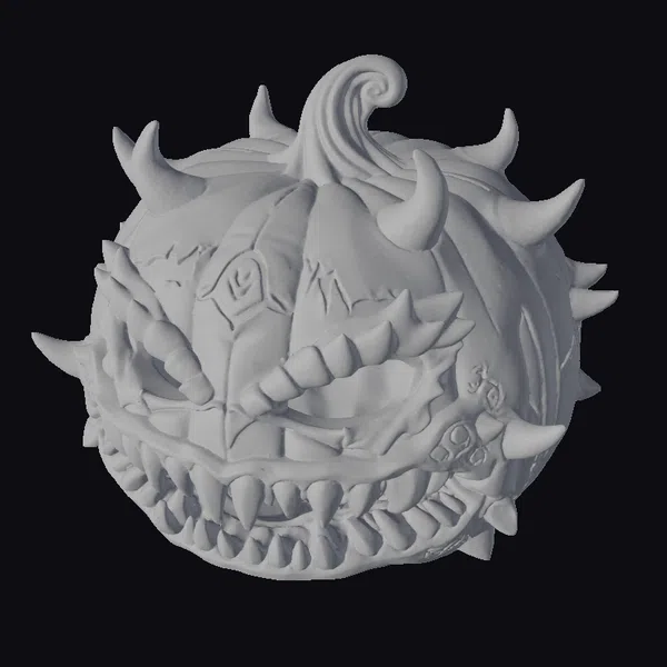 This intricately detailed demon pumpkin head boasts a surface texture resembling overlapping, jagged scales, complete with sharp spikes protruding from its top and sides. The eyes glow with an intense, molten light, as if embers from the underworld fuel its malevolent stare. With a wide, toothy grin and twisted, organic appearance, this pumpkin exudes a sense of dark magic and foreboding. Its eerie presence makes it perfect for use in horror-themed games, animations, or as a chilling decorative piece for Halloween. The model’s level of detail, from the texture of the skin to the glowing effect within, ensures a high-quality visual impact.