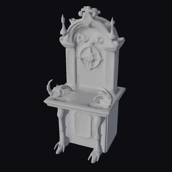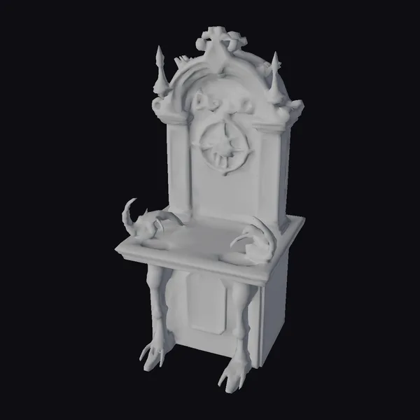Perched atop a square base adorned with skeletal legs ending in sharp claws, the demonic altar rises like a monolith, its red and black surface etched with mysterious symbols. The altar’s table-like top supports a majestic arch, crowned with spires and mythical creatures, while a central wheel-like structure hints at dark rituals. Crafted with meticulous detail, this model invites use in games, 3D printing, VR/AR experiences, and animations, transporting viewers to realms of fantasy and horror. Its ornate design and eerie ambiance make it a compelling addition to any dark fantasy setting.