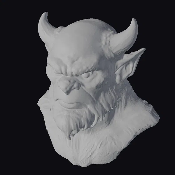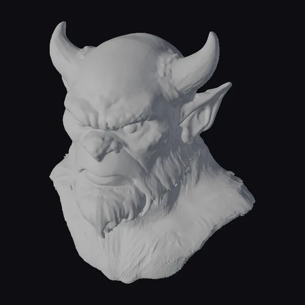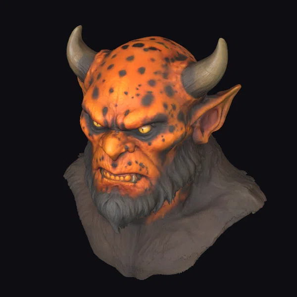 This demonic creature head boasts an intense appearance, with a vibrant orange complexion covered in dark spots, adding to its otherworldly allure. The sharp, curved horns atop its head and the wild, flowing beard contribute to its fearsome demeanor. The model’s attention to detail, from the texture of the skin to the expression of malevolence in its eyes, makes it a compelling addition to any fantasy or horror project. Its realistic style and menacing presence make it ideal for use in games, animations, or as a 3D printed collectible.