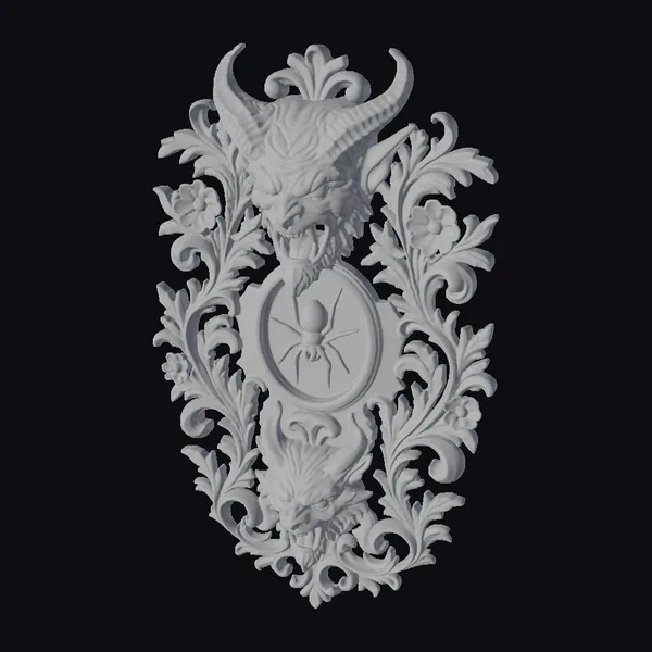 This intricately designed plaque showcases a devil’s head with menacing horns and sharp teeth, positioned above a golden spider emblem set against a dark background. Below, a wolf’s head peers out from the ornate foliage. The plaque’s surface is a tapestry of colors, with gold, red, and blue hues that dance across its surface. The floral patterns, a mix of orange flowers and green leaves, frame the central figures with a sense of dynamic movement. Crafted with meticulous attention to detail, this plaque is perfect for those who appreciate dark fantasy and gothic aesthetics. Its detailed design makes it an excellent choice for use in games, 3D printing, VR/AR experiences, animation projects, and interior design concepts.