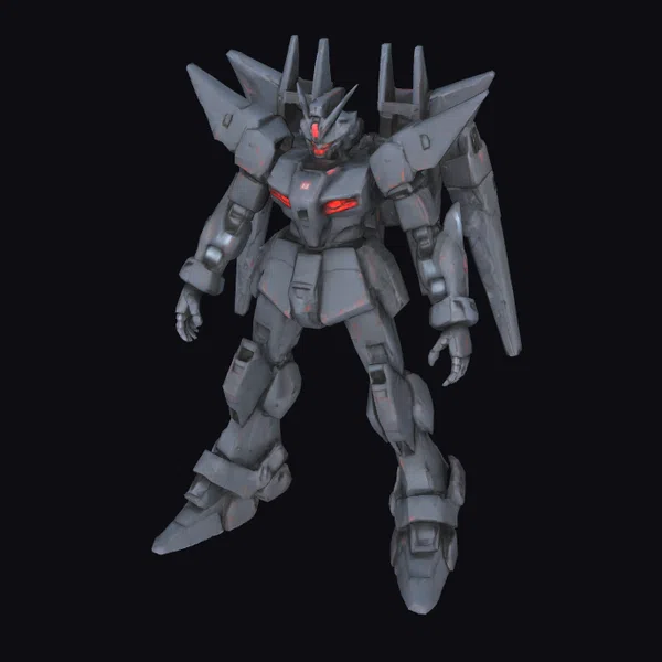 Standing tall with an imposing, angular silhouette, this formidable demonic mecha exudes a sense of dark power. Its dark gray armor, forged from metallic materials, features sharp, jagged edges and red glowing accents that evoke a sense of menace. The mecha’s pose suggests dynamic movement, as if it’s about to spring into action.