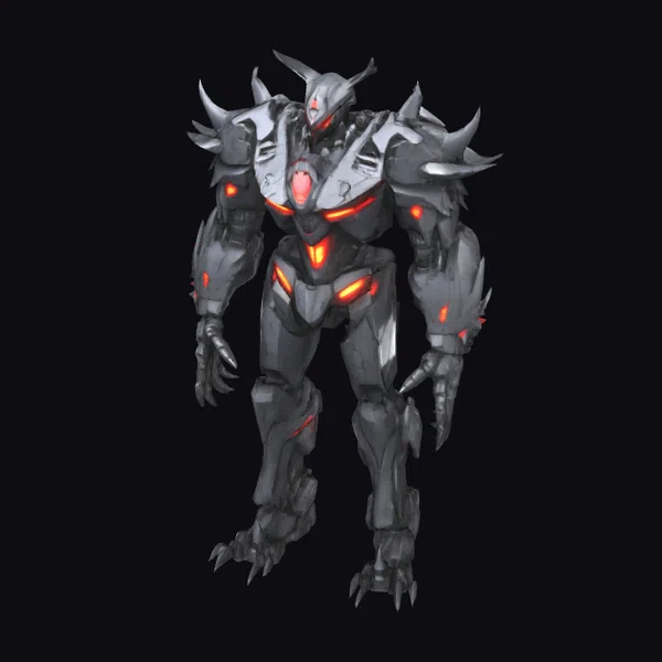 This formidable demonic mecha robot stands with a confident stride, its angular silhouette reminiscent of a futuristic combat machine. The armor is forged from a dark metallic material, with sharp spikes protruding from the shoulders, arms, and legs, giving it a menacing appearance. Glowing red accents line the joints and core of the robot, casting an eerie light on the surrounding environment. The robot’s design is a masterful blend of mechanical and demonic elements, with intricate details that suggest a rich backstory. The model is perfect for use in sci-fi or fantasy games, animations, or designs where a powerful, otherworldly presence is needed. Its unique design and menacing stance make it an excellent choice for projects that require a compelling, high-impact character.