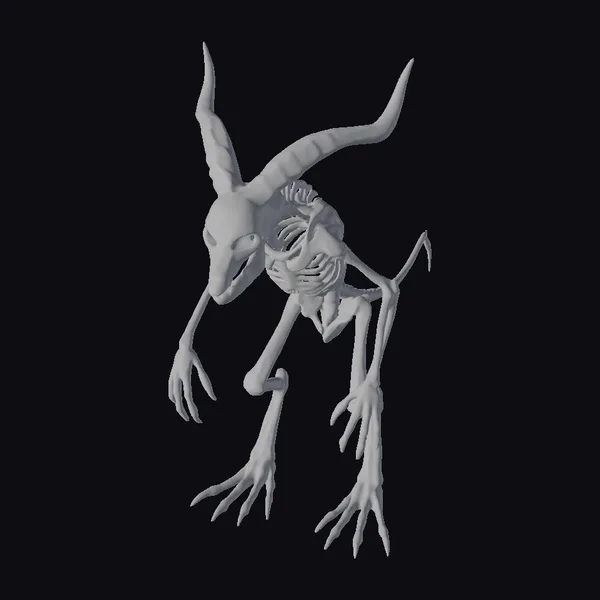 This unsettling demonic skeletal biped stands poised in a T-pose, its skeletal structure stark against a backdrop of impending doom. The creature’s skull is adorned with two sharp, curved horns that reach upwards like twisted, bony fingers. A long, pointed tail extends from its lower back, adding to its menacing silhouette. The model’s bony hands and feet are splayed outwards, showcasing its sharp, claw-like nails. The texture of the bones is rough and weathered, suggesting age and a history of dark rituals. The lack of flesh and muscle accentuates the skeletal frame, giving it a hauntingly realistic appearance. Ideal for horror game developers, animators, and designers looking to add a touch of macabre to their projects.