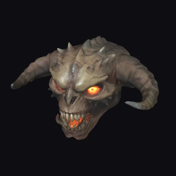 Intricately detailed, this demonic skull head model boasts a rugged, battle-worn texture, with thick, leathery flesh pulled taut over its powerful skull. The deep-set eyes glow with an otherworldly energy, casting an eerie light on the surrounding environment. Two sharp, jagged horns protrude from the forehead, adding to the creature’s fearsome appearance. The mouth is open, revealing a set of pointed teeth, giving the impression of a perpetual snarl. This model is perfect for use in games, 3D printing, VR/AR experiences, animation, and design projects, where a touch of dark fantasy is required.