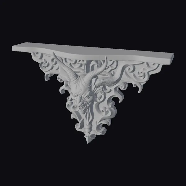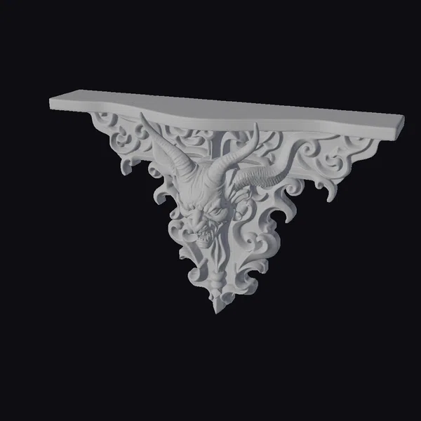 Perched on a stark white background, this demonic wall sconce corbel commands attention with its fearsome visage and intricate design. The corbel’s body is a masterclass in dark fantasy, with curling tendrils and sharp horns framing a menacing face with piercing red eyes. A flat surface at the top and a flat back make it ready for mounting, perfect for adding a touch of the macabre to interior designs, games, or VR/AR environments. Its ornate details and bold color scheme of black and red make it a focal point in any setting, from gothic-inspired interiors to dark fantasy worlds. Designers and artists will appreciate the high level of detail, making it ideal for projects requiring a unique, eye-catching element.
