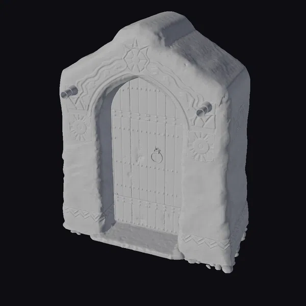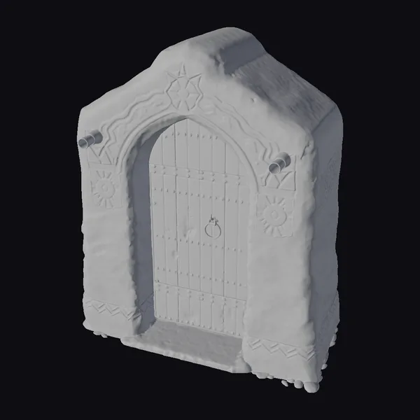Gaze upon the intricate details of this desert arch portal, where the warm, earthy tones of the stone façade are accentuated by symbolic sun designs. The wooden door, adorned with a sturdy iron knocker, appears weathered from the harsh desert elements. The portal’s rustic charm and mystical aura make it an ideal addition to fantasy worlds, games, or animations. Bring this captivating structure to life in your projects, whether for print, VR/AR experiences, or architectural designs.