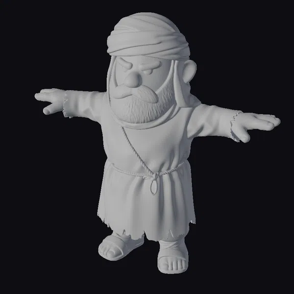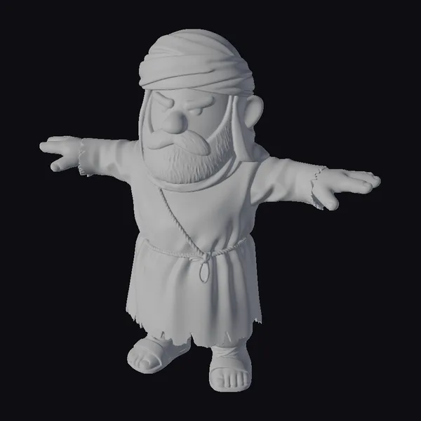 Rendered in a vibrant cartoon style, this character boasts a robust build and a distinctive appearance. His white turban is wrapped tightly around his head, framing a face marked by a thick, black beard and a stern expression. The man’s outfit consists of a tunic cinched at the waist with a rope belt, complemented by a pair of sturdy sandals. His arms are outstretched to the sides, palms upturned, conveying a sense of urgency or pleading. The model’s proportions are well-balanced, with attention to detail in the textures and folds of the clothing. The overall effect is one of rugged resilience, suitable for various applications in animation, game design, or architectural visualization.